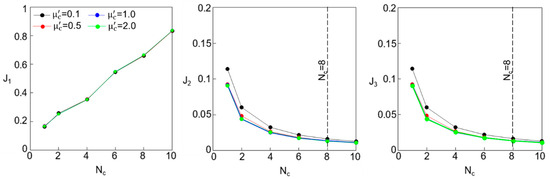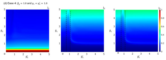 Figure 6a shows the variations in the performance indices J1, J2, and J3 with respect to the mass ratios at Point A. It can be observed that for small values of μc, the indices J2 and J3 remain relatively unchanged with respect to , indicating that they are insensitive to at low values of μc. However, as μc increases, improved performance (i.e., reductions in J2 and J3) is achieved when is increased. This suggests that, for a softer lattice (i.e., when βc = 1), enhancing the performance requires a larger . Figure 6b plots the performance indices J1, J2, and J3 with respect to the mass ratios at Point B, where the lattice is stiffer. Here, it is evident that the performance indices J2 and J3 are generally insensitive to regardless of the value of μc. Similar to the results observed for the softer lattice in Figure 6a, it is shown that for a stiffer lattice, as in Figure 6b, decreasing μc improves the performance of the PFSMBI system. However, it is important to note that, from a practical standpoint, achieving a lattice with a μc value less than 1 may be challenging.