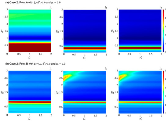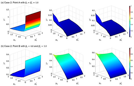 Performance indices J1, J2, and J3 plotted versus and for Case 2 corresponding to (a) Point A ( and (b) Point B (.