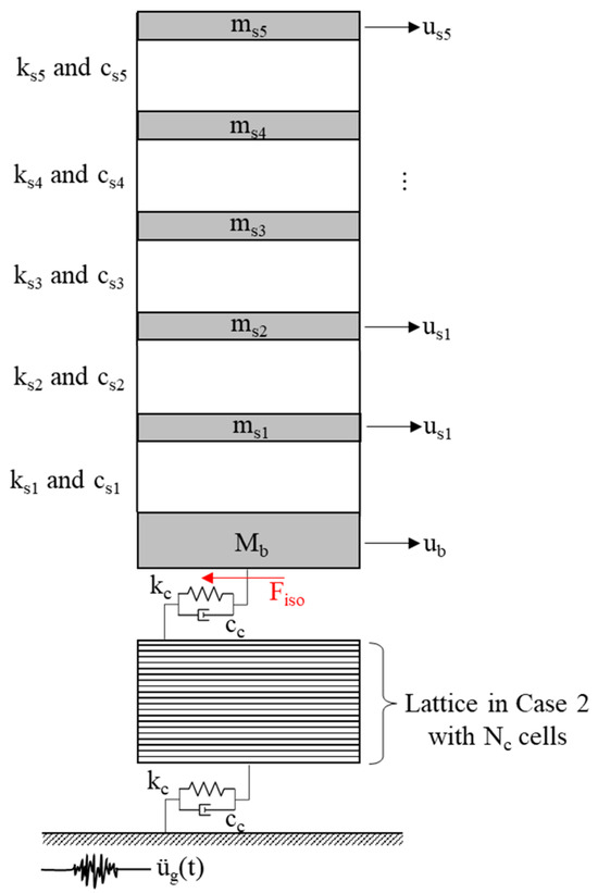 The seismic performance of the PFSMBI system, with its lattice cells configured according to Case 2 (Nc = 10), is further analyzed by implementing it in the dynamic model of a multi-story base-isolated building subjected to real ground motion records, as illustrated in Figure 9. This seismic analysis enables us to assess the effectiveness of the PFSMBI system for a broader range of input frequencies and varying levels of ground acceleration intensity. The base-isolated model of a five-story building originally introduced by Kelly et al. (1987) is selected for this seismic analysis [52]. Table 2 lists the dynamic parameters of the base-isolated model of this building, including the mass, damping coefficients, and stiffness coefficients of each floor, as well as the dimensionless parameters of the PFSMBI system.