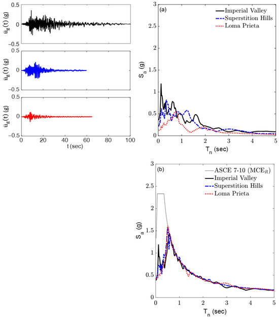 The system performance is evaluated by conducting a response history analysis (RHA) on the base-isolated building model under three selected far-field ground motion records collected in the 1979 Imperial Valley, 1987 Superstition Hills, and 1989 Loma Prieta earthquakes. These records, sourced from the Pacific Earthquake Engineering Research Center (PEER)’s strong motion database, are detailed in Table 3 [53]. To ensure consistency in the intensity levels of the ground motion records, they are scaled to match the ASCE 7-10 Maximum Considered Earthquake (MCER) design spectrum, which corresponds to a return period of approximately 2475 years. This spectrum represents the seismicity of a site in California with Site Class B, a critical damping ratio of 5%, and a peak ground acceleration (PGA) of 0.876 g. The scaling process was performed for the period range Tn = 0.05–5 s. Figure 10 illustrates the time histories of these records, along with their scaled and unscaled acceleration spectra, plotted for a critical damping ratio of ζ = 5%.