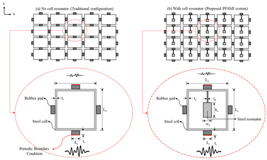 Two cell configurations: (a) Traditional cell configuration with no cell resonator where periodic steel cells are connected by rubber pads. (b) Proposed cell configuration featuring a steel resonator at the center of each unit cell (red: Periodic Boundary Condition).