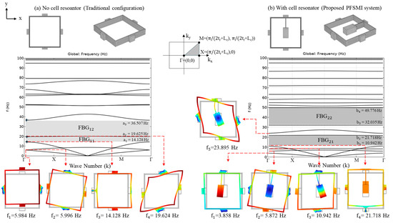 FBGs and mode shapes of the two cell configurations: (a) Traditional cell configuration. (b) Proposed cell configuration with a steel resonator.