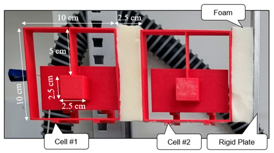 A small-scale prototype was fabricated using 3D printing for laboratory testing to examine the influence of SSM on the energy dissipation capability of the proposed isolation system and its effectiveness in controlling acceleration response, particularly during the sticking phase. The configuration of this small-scale prototype is based on the design outlined in Section 5, with adjustments to the size of the inner resonator masses and variations in the materials used for fabrication. The prototype, shown in Figure 17, consists of two cells (Cell 1 and Cell 2), each having the dimensions 100 × 100 × 25 mm. These cells are connected by a flexible foam layer with dimensions of 25 × 100 × 25 mm, and each one contains a resonator with the dimensions 25 × 25 × 30 mm with a mass of 23.25 g, which is attached to the top wall of the cell via a thin column with the dimensions of 1 × 50 × 25 mm, as illustrated in Figure 17. The cells and resonators are fabricated using Basic Polylactic Acid (PLA) through a 3D printing process.