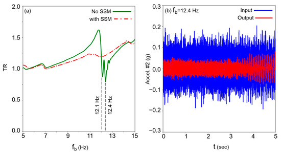 Experimental study results considering effects of SSM: (a) transmissibility ratio and (b) input vs. output acceleration for fb = 12.4 Hz.