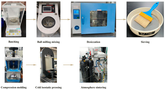 AlN (Tokuyama soda., Tokyo, Japan, 99.8%, Grade H), FeNi (NiWire Industries Co., Ltd., Shanghai, China, 99%, LR), and Y2O3 (Jiangyin Jiahua new material resources Co., Ltd., Jiangyin, China, 99.9%, GR) were used as raw materials. As shown in Figure 1, FeNi was added to the AlN matrix at 0, 5, 10, 15, and 20 wt%, respectively, with 4 wt% Y2O3 serving as a sintering aid. The powders were mixed thoroughly using ethanol (the mass ratio of powder to ethanol was 1:1) as a grinding medium in a roller mixer at 220 r/min for 24 h. After drying, the mixed powder was screened through an 80-mesh sieve. Green compacts were formed under a pressure of 20 MPa, and their density was further enhanced by cold isostatic pressing at 200 MPa. The AlN/FeNi composites were prepared in a 99.999% high-purity nitrogen atmosphere with a controlled heating rate of 10 °C/min and a temperature of 1800 °C for 2 h.