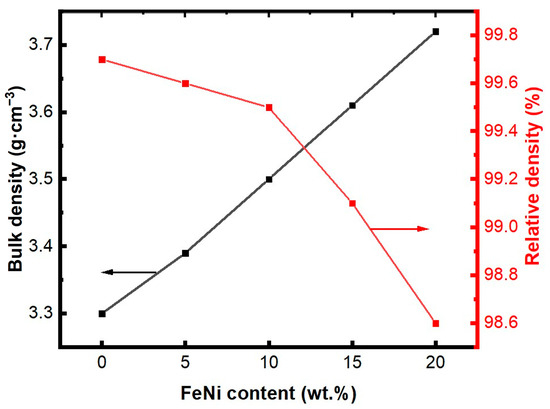 Figure 2 illustrates the density and relative density curves for AlN/x wt% FeNi composites. As depicted, the bulk density of the composites increases with the addition of FeNi alloy. This increase is attributed to FeNi’s higher density compared to AlN. Conversely, the inclusion of FeNi alloy also results in a reduction in the AlN/FeNi composites’ relative density. This is likely due to the inherent heterogeneity between FeNi and AlN, which creates non-uniform interfaces and diminishes the degree of densification, thereby increasing material loss. Nevertheless, due to the high diffusivity of the FeNi alloy, it enhances the mass transfer of the composite materials during the sintering process, facilitating densification. Additionally, the formation of Y-Al-O low-melting point compounds between FeNi and AlN grains promotes the bonding between these grains. Consequently, when the FeNi alloy content reaches 20%, the AlN/FeNi composite retains a high relative density of 98.6%.