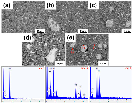 SEM images and EDS spectra of AlN/x wt% FeNi composites, x = (a) 0, (b) 5, (c) 10, (d) 15 and (e) 20.