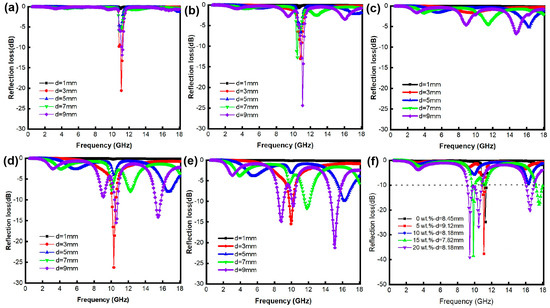 Reflection loss curve of AlN/x wt% FeNi composites, (a) x = 0, (b) x = 5, (c) x = 10, (d) x = 15, (e) x = 20. (f) Reflection loss curve of AlN/x wt% FeNi composites at the optimal thickness.