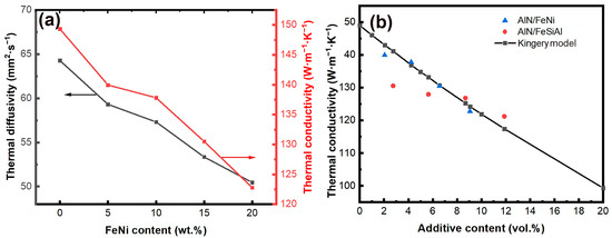 (a) Thermal diffusion coefficient and thermal conductivity of AlN/x wt% FeNi composite ceramics. (b) Relationship between the thermal conductivity of AlN-based composite ceramics and the volume content of absorbing agent. The AlN/FeSiAl data come from the study of Wang et al. [19].