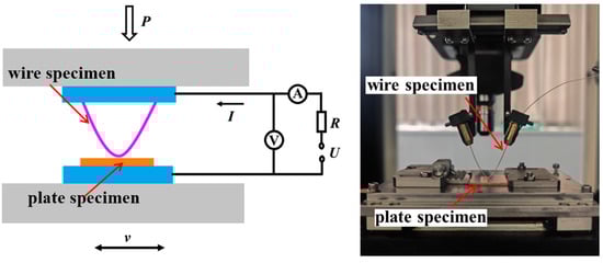 The experiment was conducted on a custom-built current-carrying friction and wear tester (Figure 2) [19]. A DC constant current source was used as the power supply. The direction of friction was perpendicular to the grinding direction of the plate specimen. The friction pair performed reciprocating sliding with a stroke of 5 mm, a frequency of 1 Hz, a current of 3 A, and a duration of 500 s (500 cycles) under loads of 0.025 N, 0.05 N, 0.075 N, and 0.1 N. After the friction and wear test, a JSM-5610LV scanning electron microscope (SEM, JEOL Ltd., Tokyo, Japan) was used to observe the worn surface, and an Rtec MFT-5000L 3D profilometer (Rtec, San Jose, CA, USA) was used to examine the 3D morphology of the wear surface. The surface elements of the material after wear were analyzed using an energy-dispersive spectrometer (EDS, JEOL Ltd., Tokyo, Japan).