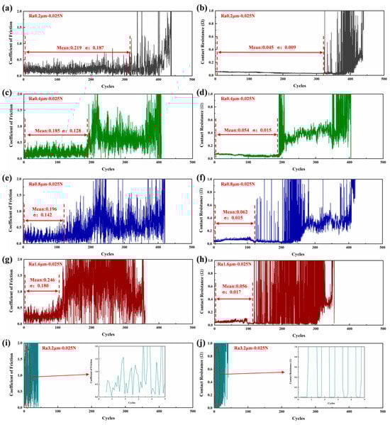 Figure 3b,d,f,h,j show the dynamic contact resistance for different initial surface roughness levels. From the figure, it can be observed that the contact resistance follows the same trend as the friction coefficient. In the early friction stage, the contact resistance remains stable, with small fluctuations, with an average value ranging between 0.045 and 0.062 Ω and a standard deviation between 0.009 and 0.017 Ω. Subsequently, the contact resistance fluctuates violently, with significant abrupt changes, and the electrical contact performance starts to deteriorate. At this point, the friction pair is considered to have failed, losing its good conductivity. The lifespan of the friction pair decreases with an increasing initial surface roughness, reaching a maximum of 320 cycles at Ra 0.2 μm and a minimum of 0.7 cycles at Ra 3.2 μm.