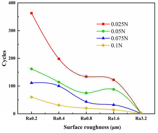Figure 4 shows the trend in the friction pair’s lifespan varying with the surface roughness under different loads. It can be seen from the figure that the lifespan of the friction pair decreases gradually as the surface roughness increases. As the load increases, the lifespan of the friction pair gradually decreases. When the initial surface roughness is Ra 0.2 μm and the load is 0.025 N, the lifespan of the friction pair reaches a maximum of 320 cycles.