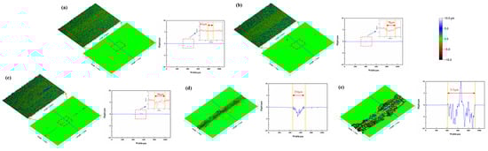 Figure 5 shows the three-dimensional morphology and corresponding height curves in different cycle periods under the conditions of Ra 0.2 μm and a load of 0.025 N. The cycles are 100, 200, 300, 400, and 439, respectively. From the figure, it can be observed that after 100 (Figure 5a) and 200 (Figure 5b) cycles, the wear surface’s width is approximately 65~75 μm, and the wear primarily manifests as micro-convex peaks being flattened, gradually forming a relatively smooth wear surface. When 200 cycles are reached, the wear area’s depth is approximately 0.3~0.5 μm. After 300 cycles (Figure 5c), the wear surface’s width reaches 96 μm, and grooves of an approximately 1 μm depth appear in the wear area. From the height curve, it can be seen that the fluctuations in the wear area’s height increase. After 400 cycles (Figure 5d), the wear surface’s width sharply increases to 254 μm, and its depth is approximately 5 μm. After 439 cycles (friction pair failure, Figure 5e), the wear surface’s width sharply increases to 515 μm, and the range of fluctuations in the height curve in the wear area is between −10 μm and 10 μm.