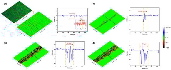 Figure 7 shows the three-dimensional morphology and corresponding height curves in different cycle periods under the conditions of Ra1.6 μm and a load of 0.025 N. The cycles are 100, 200, 300, and 371 cycles, respectively. From the figure, it can be observed that after 100 cycles (Figure 7a), the wear surface’s width is approximately 12 μm. The height of the micro-convex peaks in the wear area decreases, and the valleys become shallower. The fluctuation in the height curve of the worn surface is smaller than that in the original surface. After 200 cycles (Figure 7b), the wear track’s width sharply increases to 122 μm. The wear surface shows a depth of approximately 3~4 μm, with spot-like protrusions appearing. After 300 cycles (Figure 7c), the wear track’s width sharply increases to 329 μm, and the wear surface’s depth is approximately 8~9 μm. After 371 cycles (friction pair failure, Figure 7d), the wear surface’s width reaches 371 μm, and the range of fluctuations in the wear track’s height is between −9 μm and 3 μm.