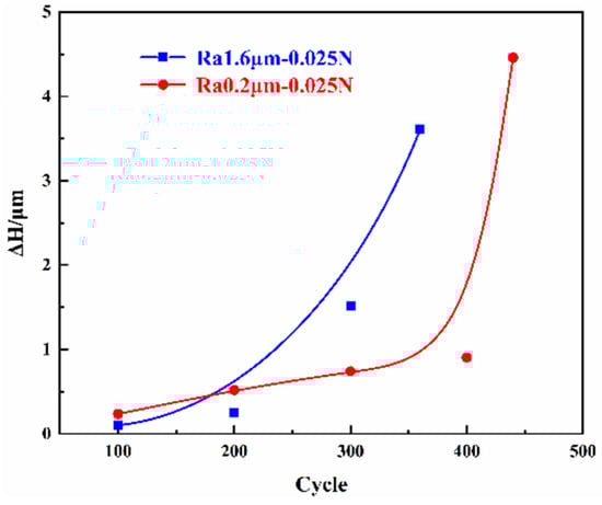 Figure 9 shows the trend in the average wear height (the absolute value of the difference between the wear surface and the original surface’s average height) as a function of the number of cycles under the conditions corresponding to Figure 5 and Figure 7. From the figure, it can be seen that as the number of cycles increases, the wear height first increases slowly and then increases sharply. In the early stage of wear, the variation in the height of the smooth initial surface is slightly larger than that in the rough initial surface. As the lifespan of the friction pair with a rough initial surface ends earlier, the variation in the height of the rough initial surface quickly surpasses that for the smooth initial surface until the tribological pair fails. The change in wear form has a significant impact on the wear height, with the appearance of arc erosion intensifying the wear.