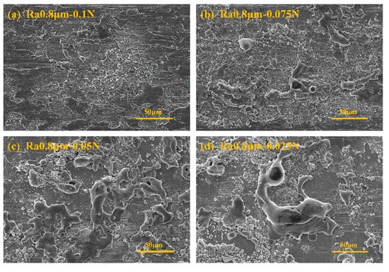 Figure 8 presents the SEM images under the conditions corresponding to Figure 7. From the figure, it can be observed that after 100 cycles (Figure 8a), the wear form is primarily furrowing, a type of mechanical wear. After 200 cycles (Figure 8b), the wear is still dominated by mechanical wear, primarily manifesting as adhesion, tearing, and furrowing, with large accumulations of wear debris on the worn surface. After 300 cycles (Figure 8c), many arc erosion traces, such as melting and spattering, appear on the wear surface. After 371 cycles (friction pair failure, Figure 8d), the wear surface still shows severe arc erosion traces, which are more serious compared to those at 300 cycles.