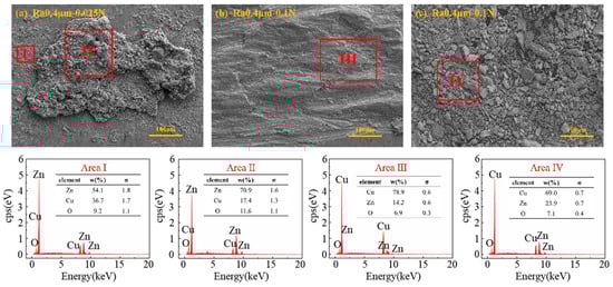 Figure 11 shows the EDS spectral characteristics of the worn surfaces and wear debris of the plate specimens under different wear forms. Figure 11a presents the EDS spectrum of the worn surface of the plate specimen under Ra 0.4 μm and 0.025 N, where the damage form is primarily arc erosion. A large amount of the Zn element originating from the wire specimen was detected on the worn surface, with its content being significantly higher than that of Cu, indicating significant material transfer during the arc erosion process. The Zn content in the molten region is slightly higher than in the splashed region. Figure 11b shows the EDS spectrum of the worn surface of the plate specimen under Ra 0.4 μm and 0.1 N, where the wear form is predominantly mechanical wear. The worn surface is mainly composed of Cu, Zn, and O elements, but the Zn content is significantly lower than that detected in the traces caused by arc erosion. Figure 11c presents the EDS spectrum of the wear debris collected under Ra 0.4 μm and 0.1 N, with the components mainly composed of Cu, Zn, and O elements. The presence of O elements was detected in all of the EDS spectra, indicating that oxidation occurred during the friction process.