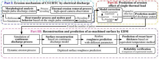 In summary, there are two pivotal issues that urgently need to be addressed in the EDM of Cf-UHTC materials. Firstly, the EDM mechanism of this type of material remains unclear, necessitating not only an investigation into the removal process of the ceramic matrix under thermal loads, but also a clarification of the role and mechanism of carbon fibers, the crucial reinforcing phase, during the material removal process. Secondly, regarding the critical metric of as-machined surface quality, there is a lack of effective prediction methods to guide the production and to analyze the continuous erosion process during its EDM. To address the challenges, this paper investigates Cf-ZrB2-SiC as a representative material. Firstly, single-pulse experiments are conducted to reveal the characteristics of electrical erosion of the material and the effects of the reinforcing phase. Subsequently, to visually explain the formation process of craters and the reasons for their differences, high-speed observation methods were employed in this study. However, the internal changes within the material remain unclear. Therefore, a coupled thermal–fluid model was established to simulate the heat transfer process and the formation of craters, and achieved crater prediction under varying parameters. Based on the above mechanistic research, a continuous discharge model with randomness was developed to reconstruct the EDM-machined surface, which can achieve the function of surface roughness prediction. And subsequently, the thickness prediction of the recast layer was realized based on the equivalent temperature method. The research process and its interconnections are illustrated in Figure 1.