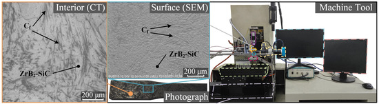 However, due to the high hardness and brittleness of Cf-UHTC, traditional machining methods such as cutting and grinding not only have serious tool wear, but also cause surface defects easily such as burrs and fiber pull-outs during machining, affecting the overall performance and reliability of the material [5,6,7]. In order to solve the problems of machining this type of high-hardness material, a variety of non-traditional machining methods have been experimented and applied, such as laser machining [8,9], ultrasonic machining [10], electron or ion beam machining [11], and electrochemical machining [12]. Although the problem of tool wear is effectively avoided, these techniques are often costly and inefficient, or limited by the differences in the properties of the composite material phases.