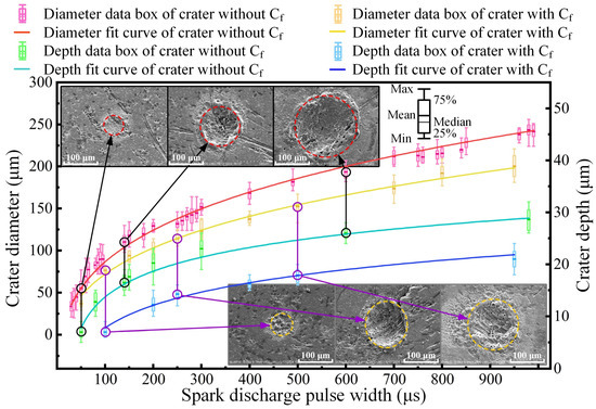 Material removal effects were observed and statistically analyzed under various pulse widths. This methodology not only facilitates the inference of material removal mechanisms under different energy levels, but also enables the establishment of a correlation between the pulse width and material removal amount. However, the experimental results indicated substantial variations in crater sizes under the same pulse width. Through extensive observation and an analysis of a large number of craters, it was found that the difference in discharge points is the primary factor contributing to the differences in discharge behavior and crater size. When the experimental data were classified based on this discovery, a clear pattern appeared. As shown in Figure 3, the experimental results illustrate the diameter, depth, and morphological characteristics of the electrical erosion craters on the material surface with various pulse widths, ranging from 20 μs to 1000 μs, presented through box plots and SEM images. It can be clearly seen from the SEM images, that the discharge craters unaffected by Cf show a relatively regular shape, with a smooth bottom surface. In contrast, the edges of craters involving carbon fibers are irregular, and the bottoms of these craters always show residual carbon fibers, and the recasting layer covers the surface of the carbon fibers in bottoms. Judging from the trends depicted in the box diagram, the results of EDM of Cf-ZrB2-SiC are significantly different from those of typical metal materials in erosion results. With regard to the crater diameter, the influence of Cf is not obvious at a small pulse width, but at higher energy levels, the influence of Cf on material removal becomes more obvious. In the depth direction of the crater, carbon fibers significantly inhibit the removal of material in this dimension. Generally speaking, the depth and diameter of the crater are positively correlated with the pulse energy, albeit with a progressively diminishing trend of increase.