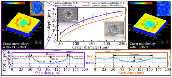 The above data were observed and measured by the OLS3000 laser confocal microscope. In order to show the relationship between diameter and depth, eight groups of crater data corresponding to the different diameter were measured and continuous curves were fitted. The statistical curves and typical profile data are presented in Figure 4. The results depicted in the curves reveal that there is nonlinear relationship between the diameter and depth. As the diameter increased, the growth rate of the depth become slowed, resulting in the ratio of diameter-to-depth gradually increasing from 6 to 9, and the shape of the craters became more flattened. Additionally, the impact of Cf can be observed more significantly. At low discharge energies, the Cf on the material surface acts as a protective layer to avoid eroding the internal material. As the energy increased, the fibers on surface were removed, which led to an increase in crater depth, but this increase was later prevented by deeper Cf layers.