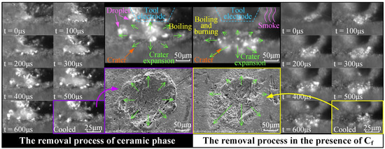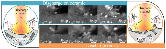 To validate this result, different pulse widths (50/300/600 μs) were used for subsequent experiments and high-speed observations, with the ceramic and fiber surfaces selected as the discharge points. The results were consistent with the above findings. Based on this research, the removal mechanism can be inferred and explained by schematic diagrams, as shown in Figure 6. In summary, when the discharge occurs at the ceramic phase, the resulting crater shape is relatively regular, and the material is removed as molten droplets and micro-fragments. Conversely, when the discharge occurs on the carbon fiber, the crater profile extends along the fiber direction, accompanied by the removal of the ceramic matrix and the fracture and combustion of the carbon fiber.