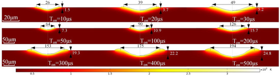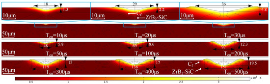 Before establishing the composite material model, a control group, that is, a homogeneous model of the ceramic phase, was established to compare the removal of materials without the influence of carbon fiber. This basic homogeneous model has two purposes: to verify the reliability of the model and to directly explain the heat removal behavior under different pulse widths. The simulation results for the removal of the ceramic phase are shown in Figure 8.