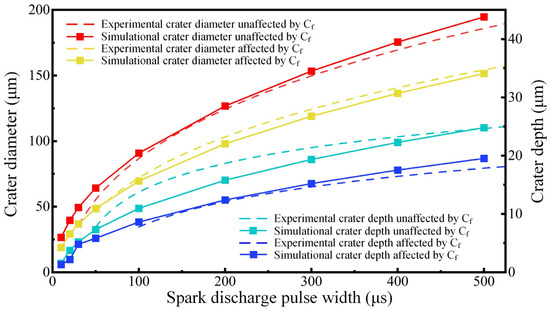 Using the model established in Section 3.3, nine groups of thermal erosion simulations were conducted with varying pulse widths. And the experiments and simulations were compared to evaluate the accuracy of the model using the experimental data from Section 3.1. For different materials, the energy distribution coefficient in the discharge process was different, which is influenced by the resistance and thermal conductivity of the material. Compared with metal materials, Cf-ZrB2-SiC had higher resistance and excellent heat dissipation capacity, resulting in a lower energy distribution coefficient. Through comparison with experimental data, it has been determined that the simulation achieves higher accuracy when the energy distribution coefficient is 0.31. A comparison between the simulation and experimental results is illustrated in Figure 10.