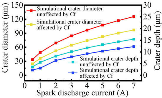 By studying single-pulse experiments, high-speed camera observations, and thermal erosion simulations, the mechanism of material removal was clearly expounded from multiple perspectives, including the formation process of the erosion crater, material phase transformations and the role of reinforcing phase. However, a critical issue is still unsolved: the influence of key parameters on material removal. Although the above experiments mainly show the influence of pulse width on processing results, for transistor power supplies, the current also significantly affects the experimental results. Although simulation results can be obtained through the variable current experiments, this method involves a complicated process, requires a variety of equipment for discharge, observation, and statistical analysis, and it is not practical to test all combinations of current and pulse width exhaustively. The most important is that this method is not a convenient and effective method for guiding actual production. On the contrary, it is a simple, fast, and economical method to predict the processing results by using the simulation model. While in order to achieve this goal, two tasks need to be completed: first, the accuracy of the model needs to be verified to ensure that the simulation results of the existing model match experimental data; and second, the relevant parameters should be tested by the model to complete erosion simulations under different conditions.