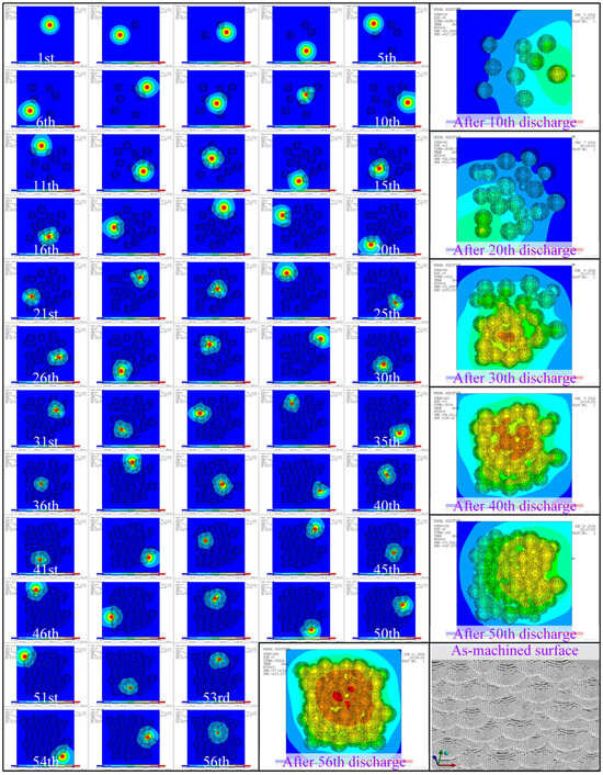 A workpiece model with a length of 120 nodes, a width of 120 nodes, and a height of 75 nodes was established by using the finite element method to simulate the continuous discharge process. A too-large cell size can lead to morphological distortion, while a too-small cell size will lead to too many nodes and a huge computation. The EDM process was simulated using the continuous discharge model under the conditions of the sustaining voltage of 20 V, the sustaining current of 3 A, each pulse width of 100 μs, and an interval between pulses of 50 μs. The surface alterations of the workpiece are illustrated in Figure 13, which records the shape of the workpiece after each discharge and finally shows the whole as-machined surface.