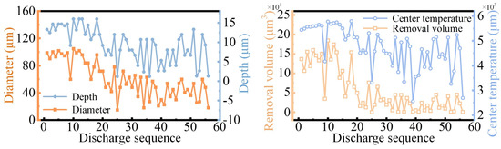 It can be seen from these four sets of data that continuous discharge is not just the direct superposition of single-pulse discharge craters. Affected by the randomness of discharge position and surface time-varying, the removal amount and the maximum surface temperature during continuous discharge are time-varying and show a decreasing trend.