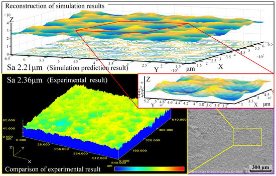 It can be observed that the characteristics of both surfaces are extremely similar, consisting of craters of varying sizes. The simulated surface looks smoother, while the measured surface presents noise-induced clutter signals. By extracting the data of the surface nodes from the model, the surface roughness (Sa 2.21 μm) can be directly calculated using Equations (14) and (15). The principle of numerical calculation is the same as the sampling principle of laser confocal microscope.