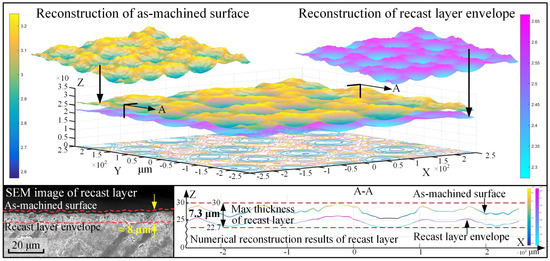 After many comparisons between simulations and experiments, the thickness prediction of the recast layer was finally realized by equivalent temperature method, as shown in Figure 16. This surface morphology was formed by the re-solidification of the molten material. The “birth and death” element method was used to mark elements that exceed a temperature of 3300 °C (which is 250 °C above the melting temperature of 3050 °C) as “dead” elements, and the materials below this threshold were regarded as the re-solidified crater bottom. Similarly, an equivalent temperature when there was no recast layer was set, and the area above this temperature but below the “death” threshold was considered to form the recast layer. Ultimately, 3050 °C was set as the equivalent temperature and elements above this temperature were removed to form the recast layer envelope surface. The thickness value of the recast layer can be obtained by comparing the as-machined simulation surface and the recast layer envelope surface, so that the thickness of the recast layer can be predicted.