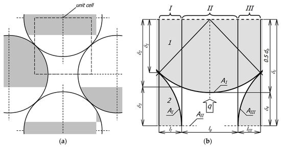 The basis for deriving the appropriate mathematical relationships is the geometric model of the medium. In this case, it is a layered, flat bed of round bars with a staggered arrangement, a fragment of which is shown in Figure 2a. Then, a periodically repeating element is isolated in this system, called a unit cell (Figure 2b). A unit cell approach is commonly used in heat transfer modeling in porous media [27,47]. This cell contains parts of bars from two adjacent layers—the upper layer was marked with the number 1, and the lower layer with the number 2. The free space (gap) between the bars is filled with gas. The cell is divided into three sections I–III (due to symmetry, sections I and III are the same). Thanks to such division, eight elements are distinguished in the cell. In sections I and III there are six elements (EI1, EIg, EI2, EIII1, EIII2, and EIIIg) corresponding to the part of the bars from the upper layer (EI1, EIII1) the part of gap (EIg, EIIIg) and the part of the bars from the lower layer (EI2, EIII2). In section II there are two elements relating to the part of the bar from the upper layer EII1 and the remaining part of the gap EIIg.