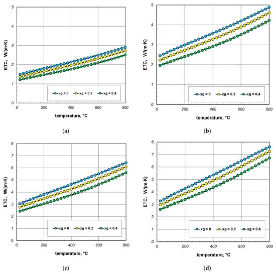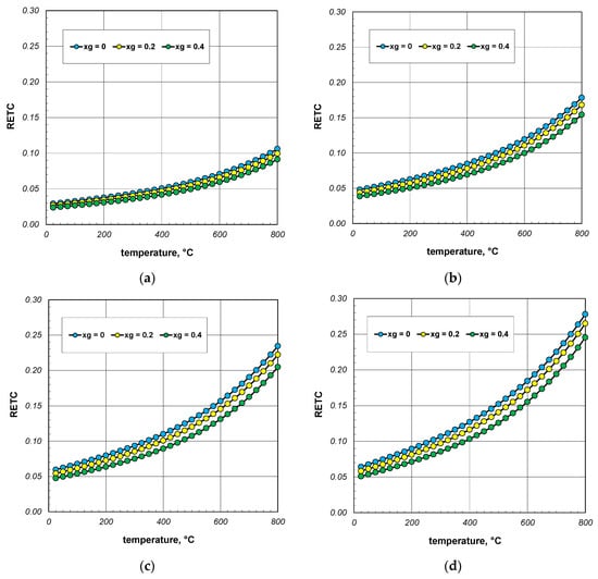 The results of ETC calculations for the case when the gas filling the bundle is air, divided by individual bar diameters, are shown in Figure 4. Each graph shows the results for three charge porosities φ in the temperature function. Parameter φ was regulated by changing the gap width lg as a multiple of the bar diameter (Equation (3)). Calculations were performed for three values of the coefficient xg: 0; 0.2 and 0.4. The porosities of the bundle corresponding to the respective values of xg are listed in Table 3.