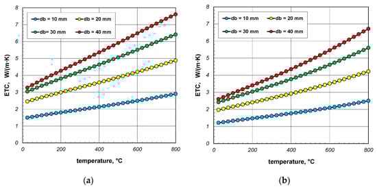 As indicated earlier, the phenomenon of thermal radiation is largely responsible for the increase in ETC as a function of temperature. The intensity of this heat transfer mechanism depends on the state of the bar surface, which is defined in the computational model by emissivity. Depending on the surface quality, the emissivity of steel varies within wide limits [60,61]. Heat-treated bars may also have different surface conditions. Therefore, in the next stage of the research, it was decided to check how the emissivity of the bars affects the ETC of the bundle. Calculations were performed for three values of εb: 0.2, 0.5, and 0.8. The calculation results obtained for 10 mm and 40 mm bars are shown in Figure 10 and Figure 11. For each of the four bundle geometries considered, it can be seen that after exceeding the temperature of 200 °C, the ETC value strongly depends on the bars’ emissivity. These results indicate that in order to correctly calculate the ETC parameter, it is necessary to accurately identify the bars’ emissivity. An incorrect determination of the εb value will result in significant distortion of the calculation results.