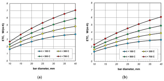 The results from Figure 6 show the changes in ETC as a function of bar diameter for four values of charge temperature: 100, 300, 500, and 700 °C. The lines in these charts are not straight. The changes in bundle ETC as a function of bar diameter can be described using a second-degree polynomial: