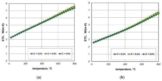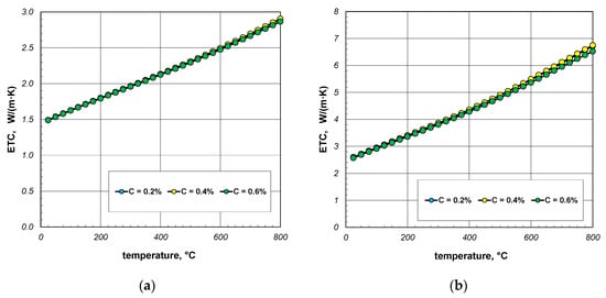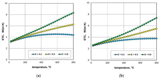 The next stage of the analysis was to investigate the impact of the thermal conductivity of steel on the ETC of the bundle. Calculations were made for three steels with a carbon content of 0.2%, 0.4%, and 0.6%. The thermal conductivity of these steels was calculated using Equation (31). The values of the ks parameter calculated for selected temperatures are listed in Table 4. The results of ETC calculations for a bundle of 10 mm bars and a porosity of 0.09 and 0.21 are presented in Figure 8. As can be seen, the thermal conductivity of the bars has a negligible impact on the ETC value. Similar results were observed for the 40 mm bar bundle, which is shown in Figure 9.