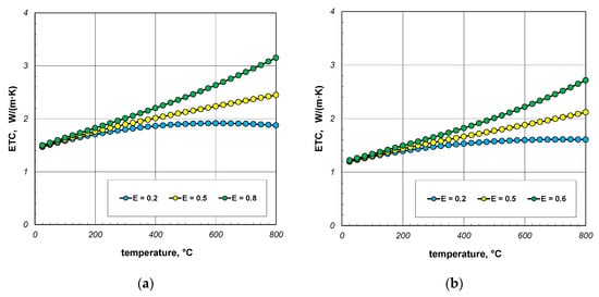 ETC of the 40 mm bar bundle depending on temperature and bar thermal conductivity: (a) bundle porosity 0.1 (xg = 0) and (b) bundle porosity 0.214 (xg = 0.4).