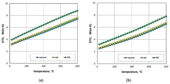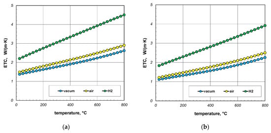 ETC of the 10 mm bar bundle depending on temperature and type of atmosphere: (a) bundle porosity 0.09 (xg = 0) and (b) bundle porosity 0.21 (xg = 0.4).
