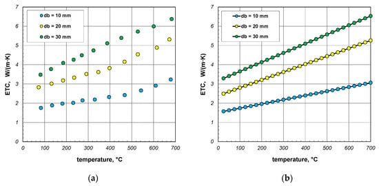 The results of model calculations and smoothed measurement data are compared in Figure 15a. The samples used during experiments were made from S235JRH steel-grade bars. The maximum carbon content in this steel grade is 0.2% [65]. For this reason, this carbon content was assumed in the model calculations when determining the ks value (Equation (31)). It was also assumed that the bar’s emissivity is 0.7. As can be seen, for all bundles the measured values are higher than the model values, and this discrepancy increases with temperature. In order to quantify this difference, the dETC parameter was used, defined by the equation: