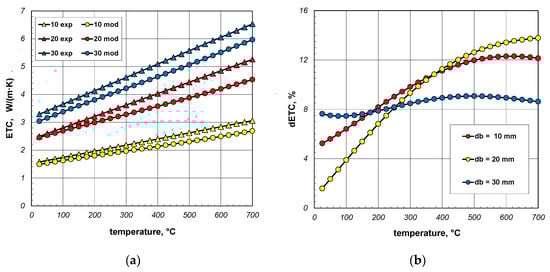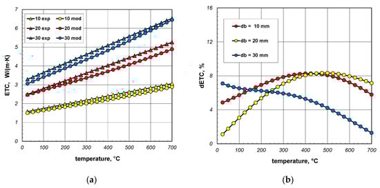 Figure 16a again compares the measured and model values of ETC. In this situation, the changes in the bar emissivity as a function of temperature, described by Equation (40), were taken into account in the model calculations. In this situation, the dETC (Figure 16b) values do not exceed 9% and the average value for all bar diameters is approximately 6%. This value is close to the measurement uncertainty of the experimental results. It can, therefore, be concluded that thanks to the change in emissivity, a very good match between the model values and the experimental data was achieved. This confirms the previous conclusion that the key problem for modeling heat transfer in a bar bundle is the selection of the bar’s emissivity.
