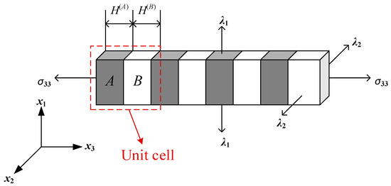 The schematic diagram of finite 1D soft phononic crystals with applied stress σ33. In this work, fixed equi-biaxial prestretch in the x1 and x2 directions is employed; that is, λ1 = λ2 = λ, and λ = 1 is adopted in this work. The unit cell is manifested by the red dashed rectangle, which is composed of material phases A and B sharing equal volume. The initial length of the unit cell H = H(A) + H(B).