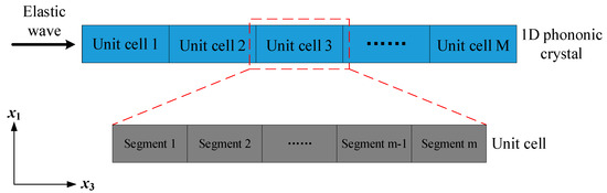 Figure 1 describes the unit cell composed of two segments filled with material phases A and B for brevity to discover the relation between the external load and mechanical properties. Here, the unit cell is assumed to consist of multiple segments to make a more general statement to formulate the TMM model focusing on longitudinal waves. The unit cell considered in the finite soft PnCs is illustrated in Figure 2.