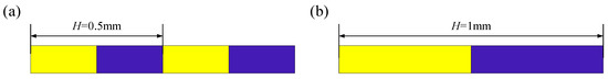 The 1D PnC whose initial unit cell length H is assumed as (a) 0.5 mm and (b) 1 mm, respectively. The analysis of band gaps based on such configurations is conducted to explain the reason for adopting N = 97 (where the color blue represents the element filled with phase A and yellow represents phase B).