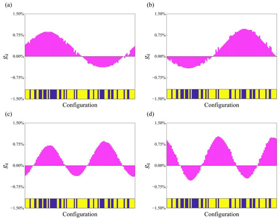 where represents the reverse of ak, that is, if ak = 0 then and vice versa. represents the corresponding bounding frequencies calculated based on the material distribution where only ak is replaced by And for offering a fair evaluation, the relative difference is applied as formulated in Equation (14). The results of sensitivity information are shown in Figure 4. It can be seen that the sensitivity to each element is different, and the maximum is about 1%, which also reflects the complexity of implementing the inverse design to generate the topology layouts for on-demand band gaps.