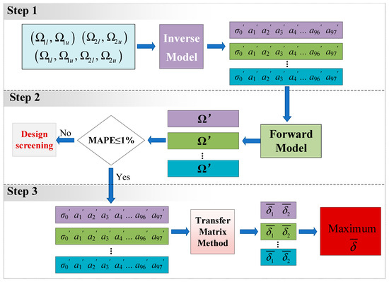 Employing the well-trained forward DNN and CVAE concurrently, the proposed DL-based inverse design framework is visualized in Figure 5, consisting of three steps to accelerate the exploration of on-demand soft PnCs. Regarding the band gaps prescribed by special requirements, the established CVAE at the first step allows the generation of multiple classes of topological layouts with predicted prestress. It is worth noting that the target characteristics of band gaps can be specified by researchers, and the training of the CVAE is performed three times independently when the input vector is designed as (Ω1l, Ω1u), (Ω2l, Ω2u), and (Ω1l, Ω1u, Ω2l, Ω2u), respectively. The second step is responsible for filtering out the unsatisfactory soft PnCs among the massive generated candidates with the aid of forward DNN, and in this work, the well-trained inverse model has been performed at a maximum of 5000 times. The error limit of MAPE less than 1% is adopted, and the soft PnCs whose bounding frequencies exceed this criterion will be removed. The expression of MAPE can be found in Equation (15). As can be seen, the inverse design with respect to special requirements of real band diagrams can be solved by accomplishing step 1 and step 2. Nevertheless, the real part of dispersion relations is unable to estimate the attenuation level of elastic waves inside the stop bands. Thus, step 3 is added to the framework, which aims at undertaking the task of ranking the feasible unit cells in terms of wave attenuation performance. The TMM is employed again at this step to calculate the attenuation constant δ, which determines the decaying degree of Bloch waves for given frequencies. Based on the comparison results of δ among the generated feasible PnCs, the topological layout within applied prestress that can possess the maximum attenuation constant is emerging and regarded as the desired solution exhibiting enhanced performance.