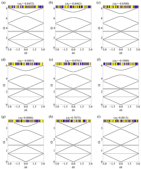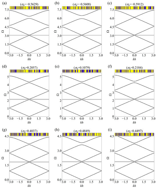 Three solutions of topological layout with prestress for the same input of bounding frequencies specified in Table 2. The continuous curves represent the corresponding real band diagrams in the mentioned cases of (a–c): Case III–I, (d–f) Case III–II, and (g–i) Case III–III. The generated configuration is displayed at the top of each plot, and the gray regions denote the prescribed stop bands.