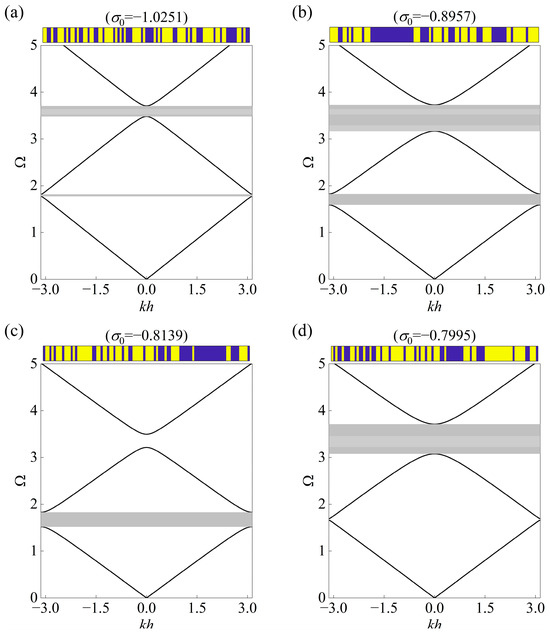 The comparison results between the band diagrams of the (a) initial design and offered design at the last step in (b) Case ①, (c) Case ②, and (d) Case ③, where the gray regions denote the stop bands of interested order. The initial and generated configurations with prestress are displayed at the top of each plot.