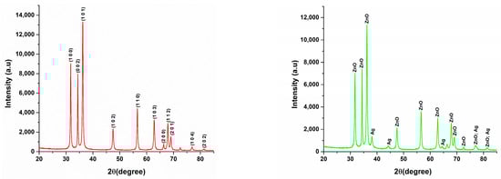 X-ray diffraction analysis offers valuable insights into the crystalline phases present in the synthesized samples, which are essential for understanding the functionality of the materials. Additionally, the diffractogram results highlight the structural differences between the two samples, allowing for an evaluation of the effects following the incorporation of silver into the ZnO-Ag composite. Both recorded diffractograms are represented in Figure 1.